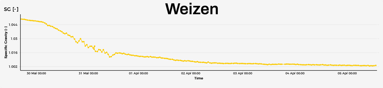 The image above is from an actual brew from the My Brewbrain platform. This brew was based on a recipe for a Weizen beer. My Brewbrain shows real-time fermentation data as gathered by your digital hydrometer.