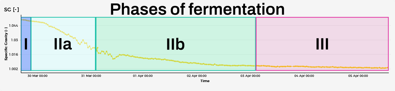 - IIb End: Tough luck for the yeast’s sweet tooth; the sugars are being decimated and converting the last ones takes more effort. You will see the SG drop with decreasing speed, and finally come to a standstill as there are hardly any sugars left to convert.